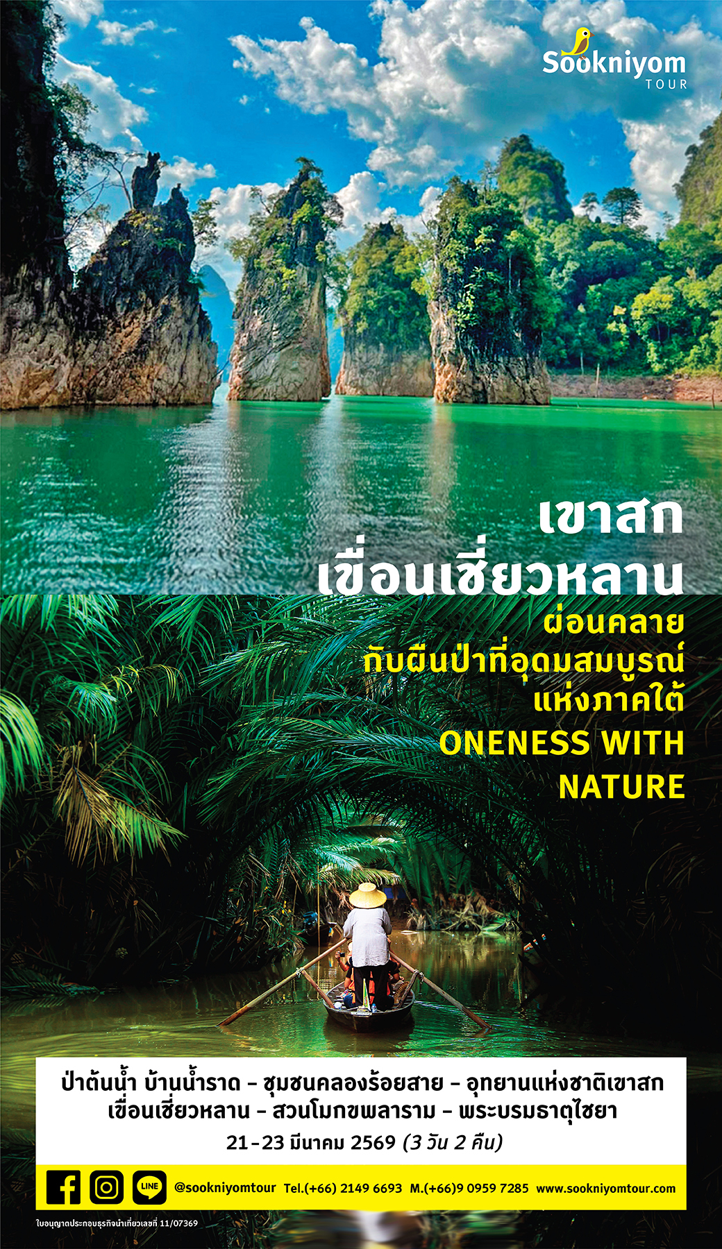 เขื่อนเชี่ยวหลาน เขาสก อุทยานมรดกอาเซียน “ขุนเขาแห่งป่าฝน” ONENESS WITH NATURE วันที่ 21-23 มีนาคม 2569 (3วัน 2คืน) สายการบินไทยแอร์เอเชีย (พระบรมธาตุไชยา – ป่าต้นน้ำ บ้านน้ำราด – เขื่อนเชี่ยวหลาน – อุทยานแห่งชาติเขาสก – สวนโมกขพลาราม – ชุมชนคลองน้อย)